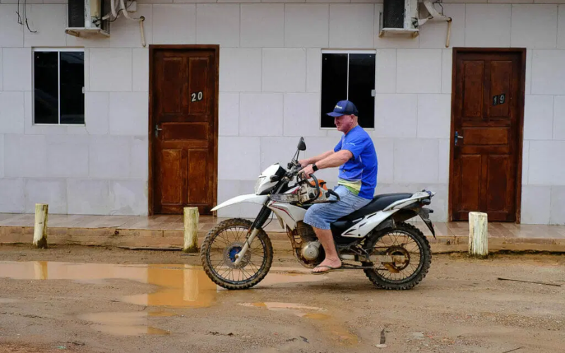 “Não pode dizer que é ruim e não pode dizer que é bom também, porque no tempo das águas (inverno amazônico) é muito ruim. O hotel fica muito fraco porque na estrada não passa nada”, lamenta. Nesta época do ano, a chuvosa, praticantes de motocross que decidem se aventurar pela estrada são alguns de seus clientes.