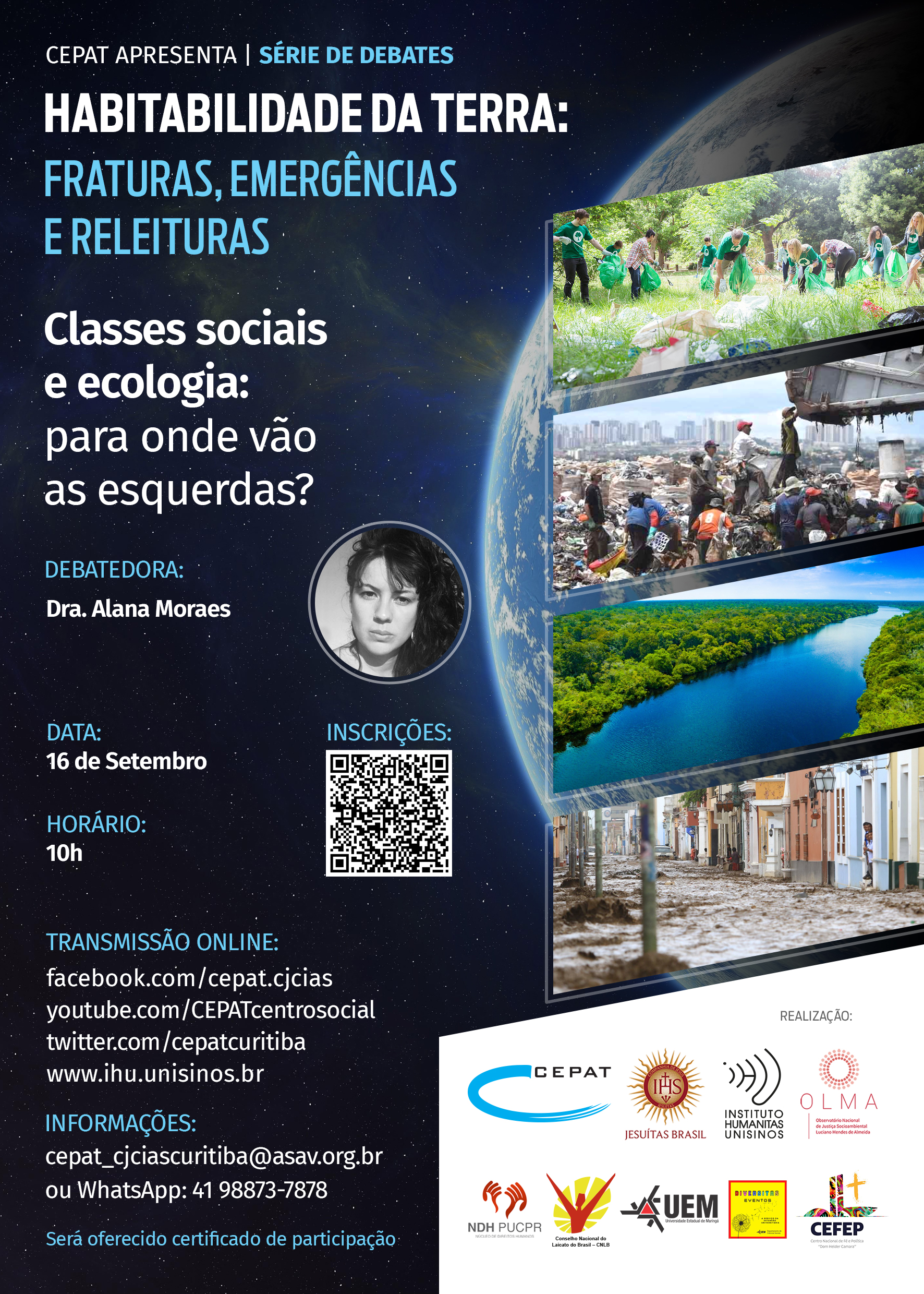 Classes sociais e ecologia: para onde vão as esquerdas? é o tema do quinto encontro da série de debates [online] intitulada Habitabilidade da Terra: fraturas, emergências e releituras, que ocorrerá no dia 16/09, às 10h, tendo como debatedora a antropóloga e pesquisadora Dra. Alana Moraes.
