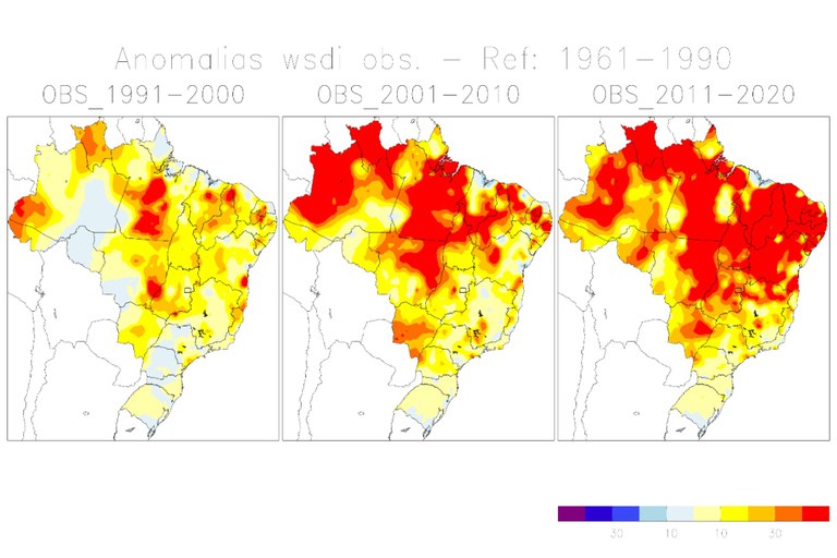 Entre 1991 e 2000, as anomalias positivas de temperatura máxima não passavam de cerca de 1,5°C. Porém, atingiram 3°C em alguns locais para o período de 2011 a 2020, especialmente na região Nordeste e proximidades. No período de referência, a média de temperatura máxima no Nordeste era de 30,7°C e sobe, gradualmente, para 31,2°C em 1991-2000, 31,6°C em 2001-2010 e 32,2°C em 2011-2020.