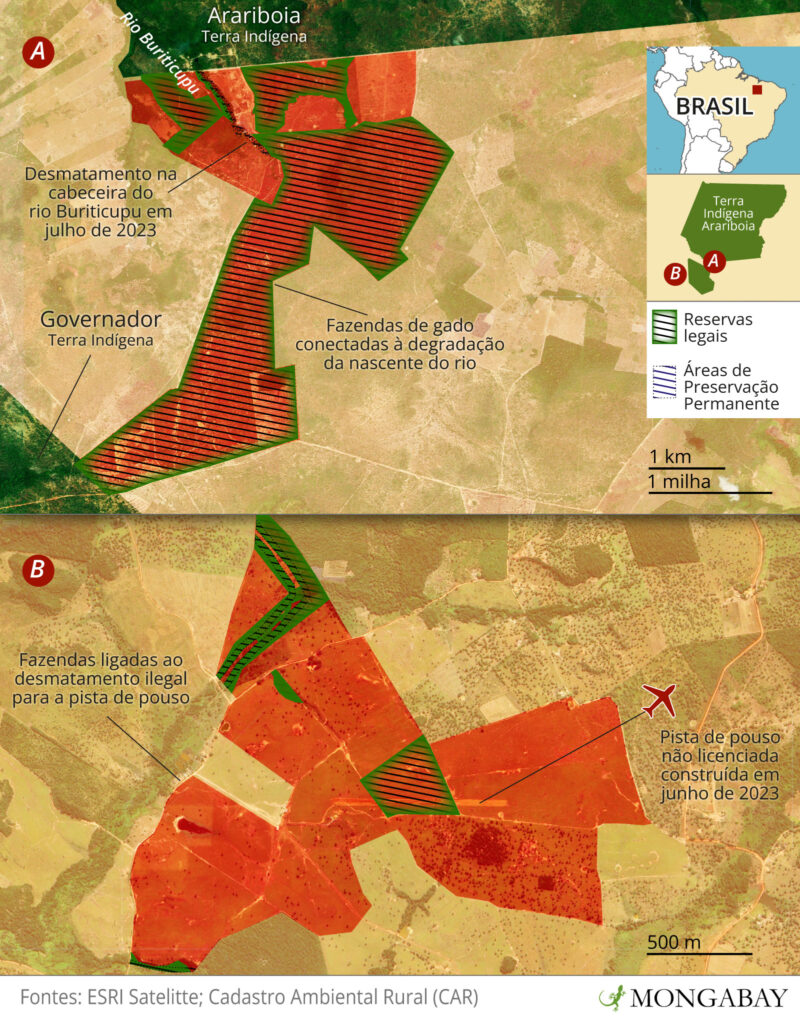 Além dos crimes dentro da Arariboia, nossa investigação também rastreou ilegalidades e atividades suspeitas nas áreas circundantes à TI. Embora a localização das fazendas ao redor da Arariboia não seja ilegal, encontramos desmatamento em desacordo com o Código Florestal dentro dessas áreas. Em julho de 2023, foi detectado desmatamento ilegal nas margens da cabeceira do rio Buriticupu, do qual o povo Guajajara depende para sua subsistência, a menos de um quilômetro da Arariboia. Um mês antes, uma pista de pouso sem licença começou a ser construída a cerca de 17 km de Arariboia e a 4 km da vizinha Terra Indígena Governador.