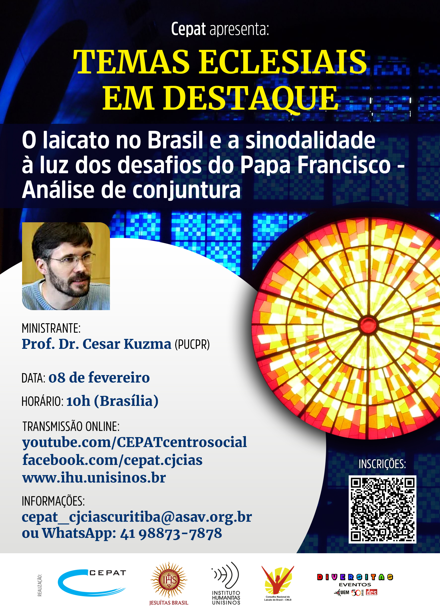 O laicato no Brasil e a sinodalidade à luz dos desafios do Papa Francisco é o tema da análise de conjuntura que o CEPAT promoverá no dia 08 de fevereiro, um sábado, às 10h, ministrada pelo Prof. Dr. Cesar Kuzma (PUCPR).