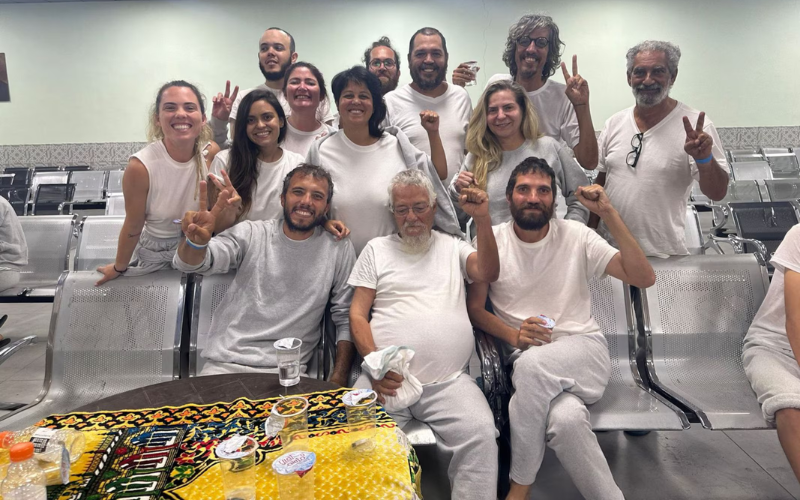 Foto dos 13 brasileiros reunidos na Jordânia, após serem libertados da prisão em Israel. Foto: Divulgação/Global Sumud Flotilla