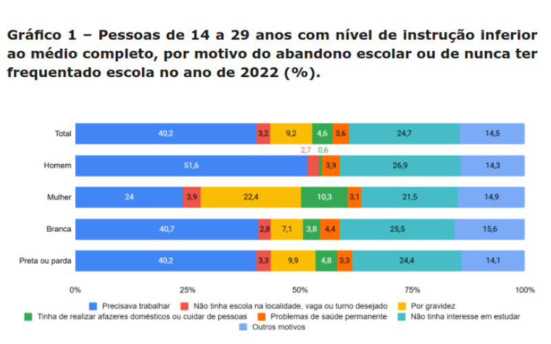 Ademais, a juventude abandona os estudos devido, especialmente, ao trabalho. Conforme IBGE (2023), cerca de 9,8 milhões de jovens entre 15 e 29 anos abandonaram a escola sem a conclusão da Educação Básica em 2022. Desse número, é significativo o abandono nas faixas entre 18 e 24 anos e entre 25 a 29 anos. Na primeira faixa, foram 4,7 milhões de abandono escolar e, na segunda faixa, 4,6 milhões com a Educação Básica incompleta. A faixa entre 15 e 17 anos apresenta o menor número, com 462 mil abandonos escolares. Vale ressaltar que o número de abandono é maior entre os jovens homens, com 58,5%, do que em relação às jovens mulheres, que somam 41,2%. Em relação à raça, a diferença é gritante, enquanto 27,9% dos que abandonam os estudos são brancos, 70,9% são negros. Quando buscamos os motivos, a necessidade de trabalhar aparece como justificativa prioritária, mesmo para ambos os sexos e para as raças branca e negra. Considerando o total de jovens entre 14 e 29 anos com nível de instrução inferior ao Ensino Médio completo que abandonaram os estudos, 40,2% apontaram o trabalho como motivo em 2022, sendo que para os homens esse número chega a 51,6%. Chama a atenção que, quando consideramos as jovens mulheres, ainda que em primeiro lugar esteja o trabalho como motivo para o abandono com 24%, em segundo lugar está o abandono por gravidez com 22,4%.