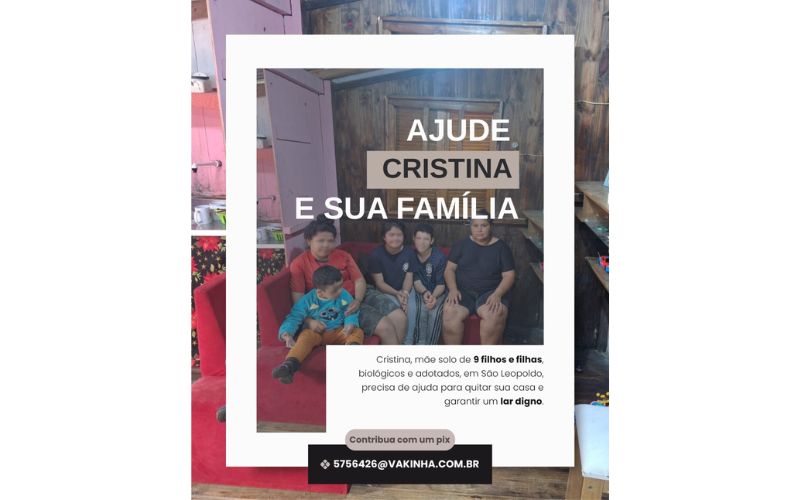 Em São Leopoldo (RS), essa realidade se traduz na história de Cristina, mãe solo de nove filhos e filhas, entre biológicos e adotados. Cristina está próxima de realizar um sonho antigo: viver em uma casa que pode, enfim, chamar de sua. Depois de anos vivendo de aluguel, sofrendo com despejos e incêndios, falta apenas R$ 8.500,00 para quitar o imóvel e garantir à família um lar definitivo e seguro.
