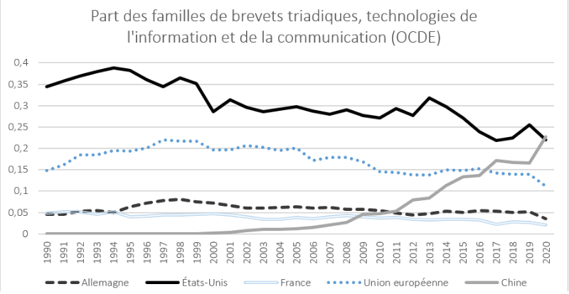 O gráfico abaixo mostra que, entre 1995 e 2006, a participação da China nos pedidos globais de patentes triádicas na área de tecnologias da informação e comunicação permaneceu praticamente inalterada. Durante esse período, a China era inexistente em termos tecnológicos. Em seguida, iniciou-se uma ascensão notável, saltando de 1% para 23% em 2020. Nesse período, a China não apenas dobrou a participação dos países da União Europeia, como os dados mais recentes disponíveis indicam que ultrapassou até mesmo os Estados Unidos.