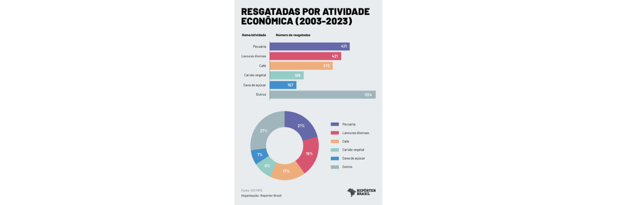 Dados oficiais compilados pela Repórter Brasil sobre fiscalizações realizadas pelo Ministério do Trabalho e Emprego, entre 2003 a 2023, mostram que pecuária, produção de café e de carvão vegetal lideram casos de trabalho análogo ao de escravo no país.