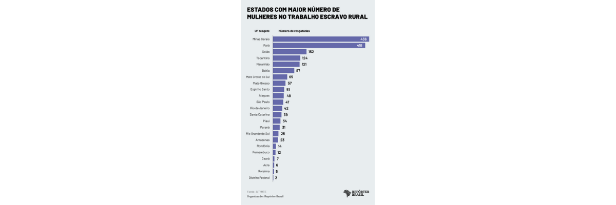 O ambiente rural é de longe o que concentra o maior número de casos de mulheres submetidas a trabalho análogo ao de escravo, como define o artigo 149 do Código Penal. Ao longo de 21 anos, 83% das 2.244 resgatadas exerciam alguma atividade no campo.
