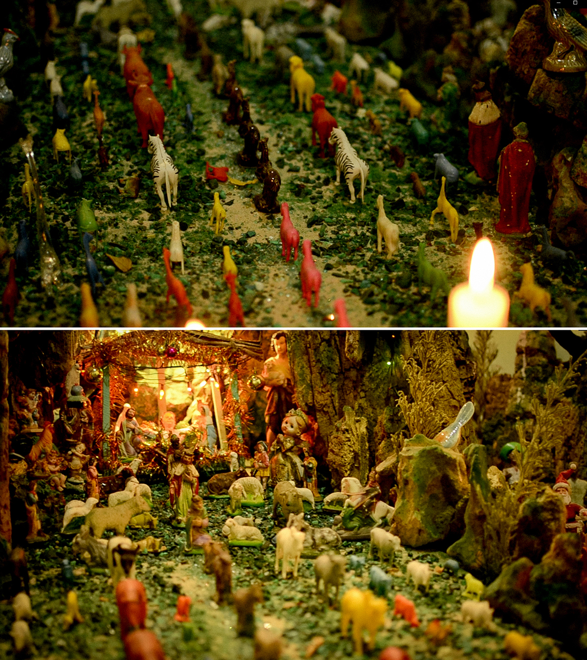 Já o altar – e falo especificamente do de Dona Pulú e do de Malvina, sua filha, que herdou as sabenças sagracionais da mãe – é montado em uma pequena mesa e baús em um canto da sala. Rodeado de imagens e no centro da mesa, um pequeno quadro amarelado e de moldura gasta com o Menino na manjedoura. Nas laterais sobem folhas de coqueiro e de bananeira que formam um arco sobre a estrutura. Aí são pendurados os adereços natalinos com pisca-pisca, brilhos, cores e formas diversificadas [imagem acima].
