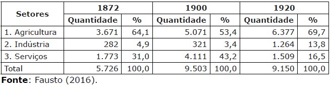 Quando esse quadro político ruiu com a destituição do Imperador e o advento da República, quase nada se alterou efetivamente, uma vez que a estrutura oligárquica de poder se moveu apenas para um lugar distinto do anterior, porém, estruturalmente convergente com a cultura do privilégio e as delimitações de classe, mantendo a ordem social vigente (Fernandes, 2006). Nos 50 anos seguintes ao Censo de 1872, haveria um esboço de mudança desse perfil, que vivenciaria um refluxo posteriormente, mas a participação da indústria cresceria vertiginosamente, como demonstra a Tabela 1: