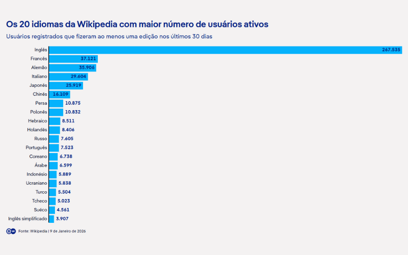 Gráfico dos 20 idiomas da Wikipédia com maior número de usuários ativos (Fonte: Wikipédia).