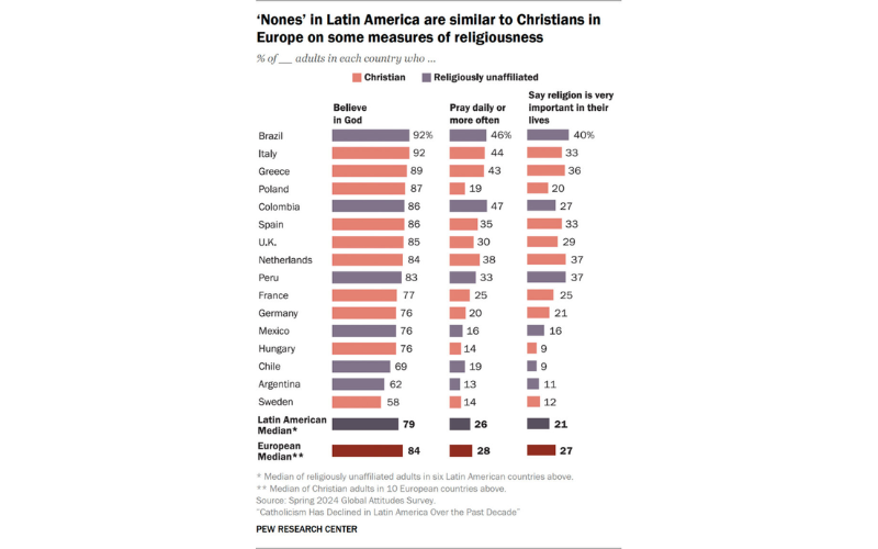 Em termos de crença e prática religiosa, o Pew Research Center descobriu que os não afiliados a nenhuma religião na América Latina eram bastante semelhantes aos cristãos na Europa.