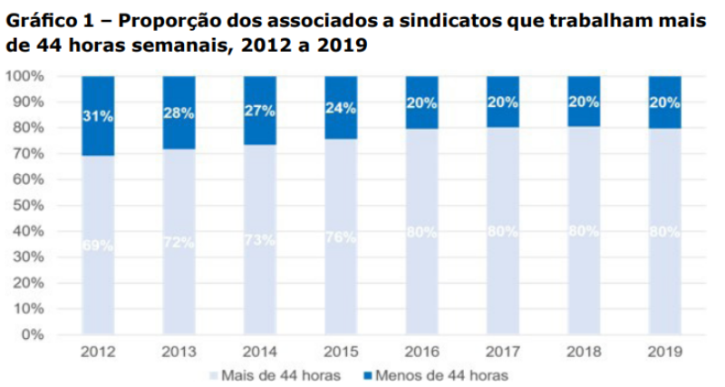 Para se ter uma ideia, dados da PNAD Contínua, realizada pelo Instituto Brasileiro de Geografia e Estatística – IBGE, entre os anos de 2012 e 2019, sobre os aspectos que envolvem os cidadãos sindicalizados, apontam que, em 2012, a proporção de associados a sindicatos que trabalhavam mais de 44 horas semanais era de 69%, conforme indica o gráfico abaixo. Essa proporção cresceu paulatinamente até 2019, alcançando o patamar de 80% dos associados, quase 8,5 milhões de trabalhadores. O significado desse dado é categórico: as jornadas e os ritmos de trabalho dos trabalhadores sindicalizados estão sendo estendidas ao limite com o passar dos anos.