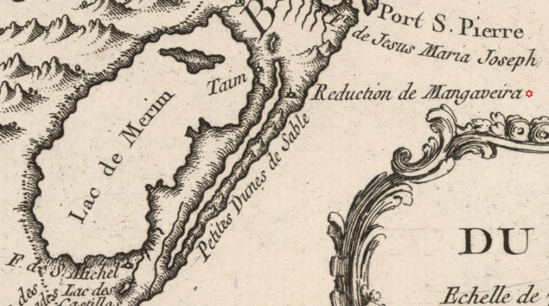 Convém assinalar que apenas Mangaveira é explicitamente designada como Reducto/Réduction na carta. A singularidade da designação não indica hierarquia superior nem exceção institucional, mas reflete uma lógica própria da representação cartográfica. As reduções interioranas, inseridas em um núcleo missioneiro amplamente reconhecido, dispensam nomeação textual explícita, uma vez que seu pertencimento ao sistema jesuítico já é pressuposto pelo contexto regional e pela simbologia empregada. Mangaveira, ao contrário, situada fora desse núcleo clássico, em uma zona costeira e fronteiriça, requer a explicitação do termo para afirmar cartograficamente um estatuto que, em outras regiões, era pressuposto. Nesse contexto, a nomeação explícita em Mangaveira é suficiente para afirmar o caráter missioneiro das ocupações litorâneas representadas no mapa, já que Taim compartilha a mesma simbologia e o mesmo enquadramento tipológico. Onde o caráter missioneiro era evidente, o mapa não precisou nomear; onde poderia haver dúvida, a designação aparece. O mapa, assim, não hierarquiza, mas estabiliza classificações, fixando o estatuto missioneiro de Mangaveira (e, por extensão, das ocupações litorâneas associadas) em um espaço que, mais tarde, seria reinterpretado como neutro, vazio ou marginal pelas narrativas territoriais posteriores.