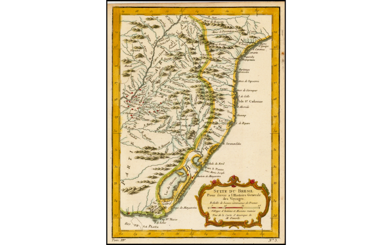 Em alguns exemplares do Suite du Brésil, posteriormente coloridos à mão, essa leitura torna-se mais fácil de perceber (Figura 2). Taim e a Réduction de Mangaveira aparecem destacados com a mesma cor atribuída às demais reduções, o que apenas reforça uma classificação já indicada pela simbologia e pela legenda originais, tornando mais visível um enquadramento que já estava presente na concepção inicial da carta.