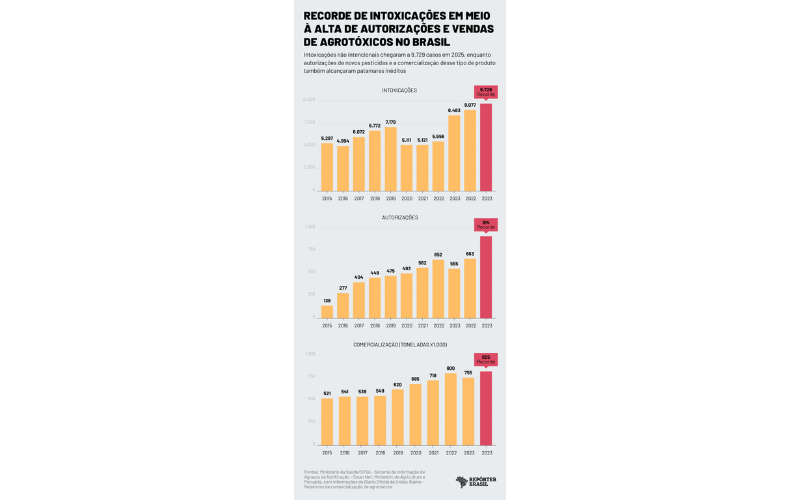 No mesmo período, o Brasil bateu recordes de aprovação e comercialização de pesticidas. Apenas em 2025, foram 914 novos registros, um aumento de 38% em relação ao ano anterior, segundo dados do Mapa (Ministério da Agricultura e Pecuária) publicados no Diário Oficial da União.