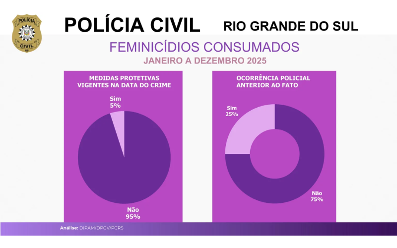 O número de feminicídios no Rio Grande do Sul foi de 80 casos em 2020, 97 em 2021, 111 em 2022, 85 em 2023, 73 em 2024 e voltou a 80 em 2025, segundo a Polícia Civil.