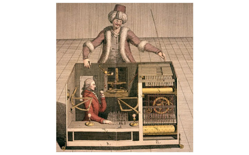 Benjamin explicou graficamente esta colaboração entre marxismo e teologia na primeira de suas Teses sobre o Conceito de História. Trata-se do relato de uma partida de xadrez. Diante de um robô, programado para ganhar sempre no xadrez, senta-se um boneco vestido à turca, sem conhecimentos de xadrez; estão sentados em uma mesa de vidro que aparenta ser transparente por todos os lados; mas, na realidade, debaixo da mesa oculta-se um anão corcunda, mestre na arte do xadrez, que, conectado por fios ao boneco, ajuda-o a ganhar todas as partidas do robô.