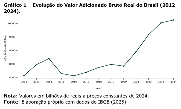 O Gráfico 1 retrata a economia brasileira no período compreendido entre os anos de 2012 e 2024. Neste recorte, destacam-se momentos distintos: o período entre 2012 e 2016 representa, para além da crise econômica e política, o fim de um ciclo de crescimento acelerado na economia brasileira. A partir de 2002, o Brasil experimentou um momento de expansão expressiva associado a boa gestão da economia que soube aproveitar o ambiente externo favorável e o boom das commodities, entre outros fatores, levando a um crescimento médio anual de 3,9% entre 2002 e 2010 (Leal e Nakane, 2025). Tal período teve papel relevante para a compreensão do comportamento observado no Gráfico 1.
