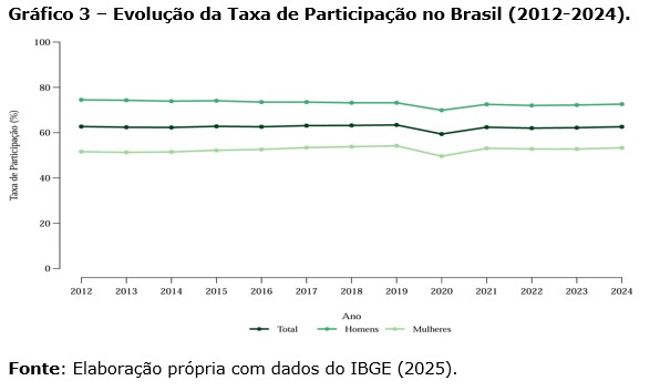 Além disso, as métricas associadas ao mercado de trabalho no Brasil revelam uma desigualdade estrutural entre homens e mulheres tanto nas taxas de participação quanto nas de desocupação, sendo esta mais volátil em função das duas crises incorridas ao longo do período no Brasil, a crise política e econômica a partir de 2015 e a pandemia da Covid-19.