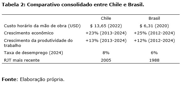 O Chile está implementando uma redução da jornada de trabalho em meio a um quadro de custos com trabalho mais de duas vezes maior que os do Brasil, tendo, ainda, um hiato menor desde a última redução da jornada de trabalho feita em 2005, em contraste aos 38 anos desde a última redução no Brasil. O Brasil, adicionalmente, conta com taxas de desemprego mais baixas em 2024 quando comparado ao Chile.