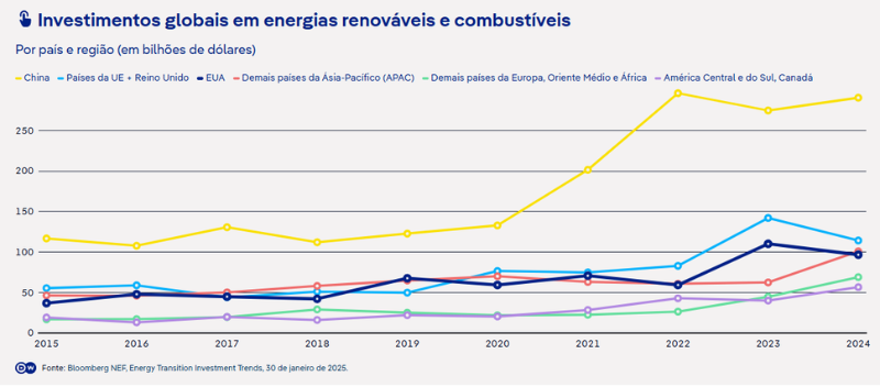 Gráfico dos investimentos globais em energias renováveis e combustíveis (Fonte: Bloomberg NEF, Energy Transition Investment Trends).