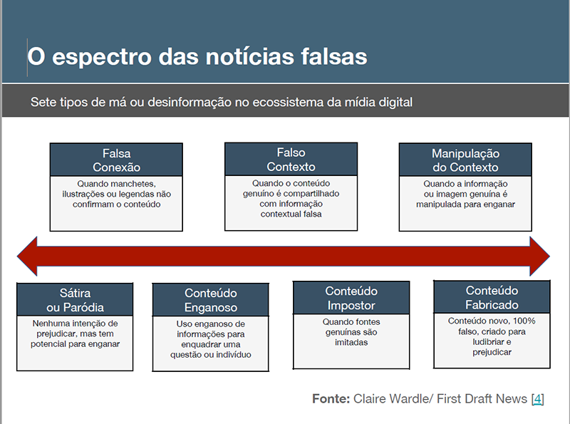 Os dados são relevantes porque o ambiente das notícias falsas é bastante amplo – e há diversos graus de informações enganosas. Segundo classificação da organização First Draft News, da Universidade Harvard, o ambiente online sofre de “poluição informacional”, e há sete tipos de enganos se espalhando na rede: desde manchetes caça-cliques, que não condizem com a reportagem, até republicação de notícias velhas e fora do contexto. Em um ambiente polarizado, esse tipo de informação se prolifera mais rápido.