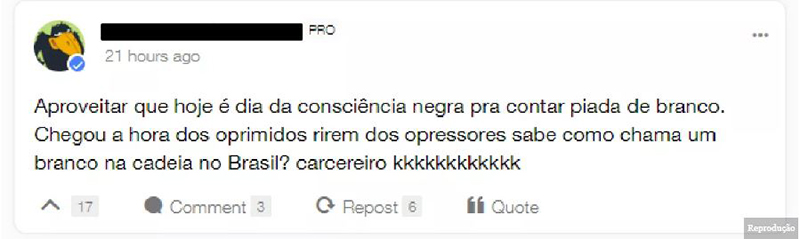 Já o terceiro post com mais interações com menção a negros no período tinha uma conotação ainda mais racista. “‘Os brancos têm uma dívida histórica com os negros’. Beleza. A minha eu paguei quando tinha 14 anos e um preto roubou meu relógio e minha carteira”, publicou o usuário Renato Monteiro. A publicação atingiu 37 curtidas, mas foi apagada depois. O mesmo perfil havia publicado outras afirmações racistas antes, mas apagou e hoje possui apenas uma publicação no Gab.