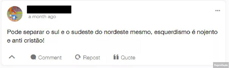 Na semana do primeiro turno, de 1º a 8 de outubro, as ofensas a esses grupos se misturavam com comentários xenófobos. “Cara, eu estou com um ódio tremendo dessas desgraças que votaram em esquerdistas, tanto aqui no Nordeste quanto nas demais regiões do país!”, com 54 likes, foi a terceira postagem com maior número de likes mencionando esquerdistas entre as analisadas.