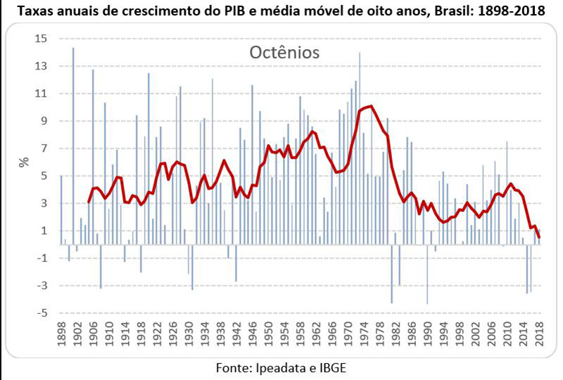 Considerando a média móvel de 8 anos, em todo o período, o atual octênio (2011-2018) apresenta o pior resultado em mais de um século, seguido pelo octênio que cobre os governos Sarney e Collor. Todos os octênios entre 1901 e 1987 apresentaram crescimento médio anual acima de 2,9% ao ano. Até hoje, o pior octênio tinha sido o de 1987-1994 que apresentou crescimento médio de 1,56% ao ano. Todavia, com a divulgação do PIB de 2018 (1,1%), pelo IBGE, o octênio 2011-2018 apresentou crescimento de somente 0,53% ao ano, o pior desempenho do período.