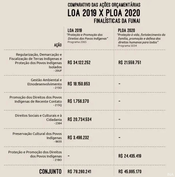 Uma nova análise, da organização Indigenistas Associados (INA), de servidores do órgão, revela um corte nominal (sem considerar a inflação do período) que supera os 40% só para o conjunto de ações finalísticas da Funai no PLOA: de R$ 78 milhões para cerca de R$ 46 milhões. Na ação referente à demarcação e proteção territorial, o corte é de 37%. As outras quatro ações previstas no orçamento dos anos anteriores, relacionadas à promoção de direitos sociais e à gestão das TIs, foram agrupadas numa única rubrica, com corte de 44,6% (veja quadro abaixo).