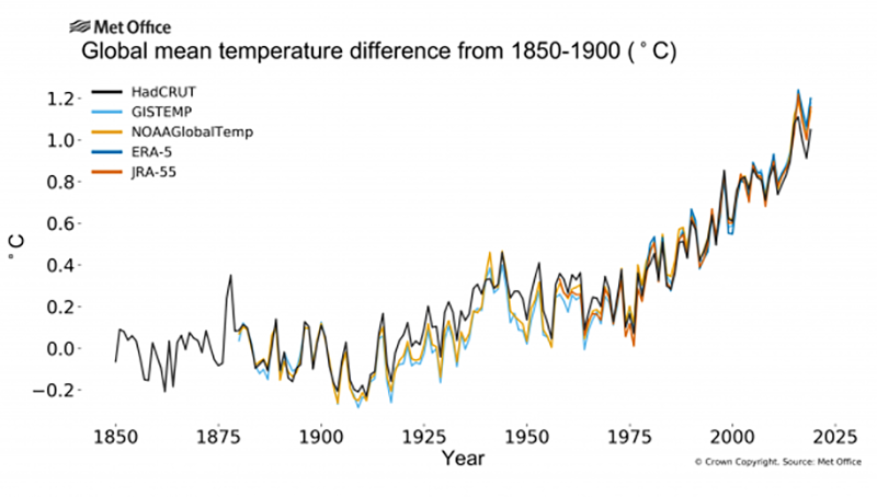 A dispersão entre os cinco conjuntos de dados foi de 0,15° C, sendo que o mais baixo (1,05° C) e o mais alto (1,20° C) foram mais de 1° C mais quentes que a linha de base pré-industrial.