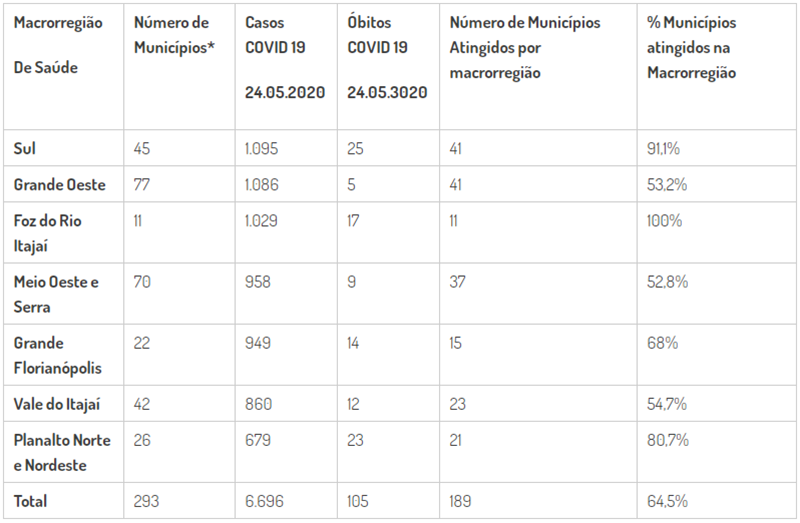 Considerando o período de um mês (24 de abril a 24 de maio), houve um aumento de 453,84% no número de casos de coronavírus, bem como no número de óbitos (150%). Quanto à distribuição do número de casos no território, no dia 24 de abril, Santa Catarina registrava 104 municípios com casos da doença, já no dia de ontem Santa Catarina registrou 189 municípios com casos de COVID 19, um incremento de 81,7% em um mês.