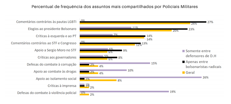 Chama atenção o interesse dos PMs por questões LGBT. O tema foi o segundo mais comentado por estes policiais, superando apenas política institucional. Críticas aos direitos dos gays e transsexuais foram mais frequentes que elogios a Bolsonaro e a comentários contra o PT e a esquerda — e 9 em cada 10 foram feitas por praças.