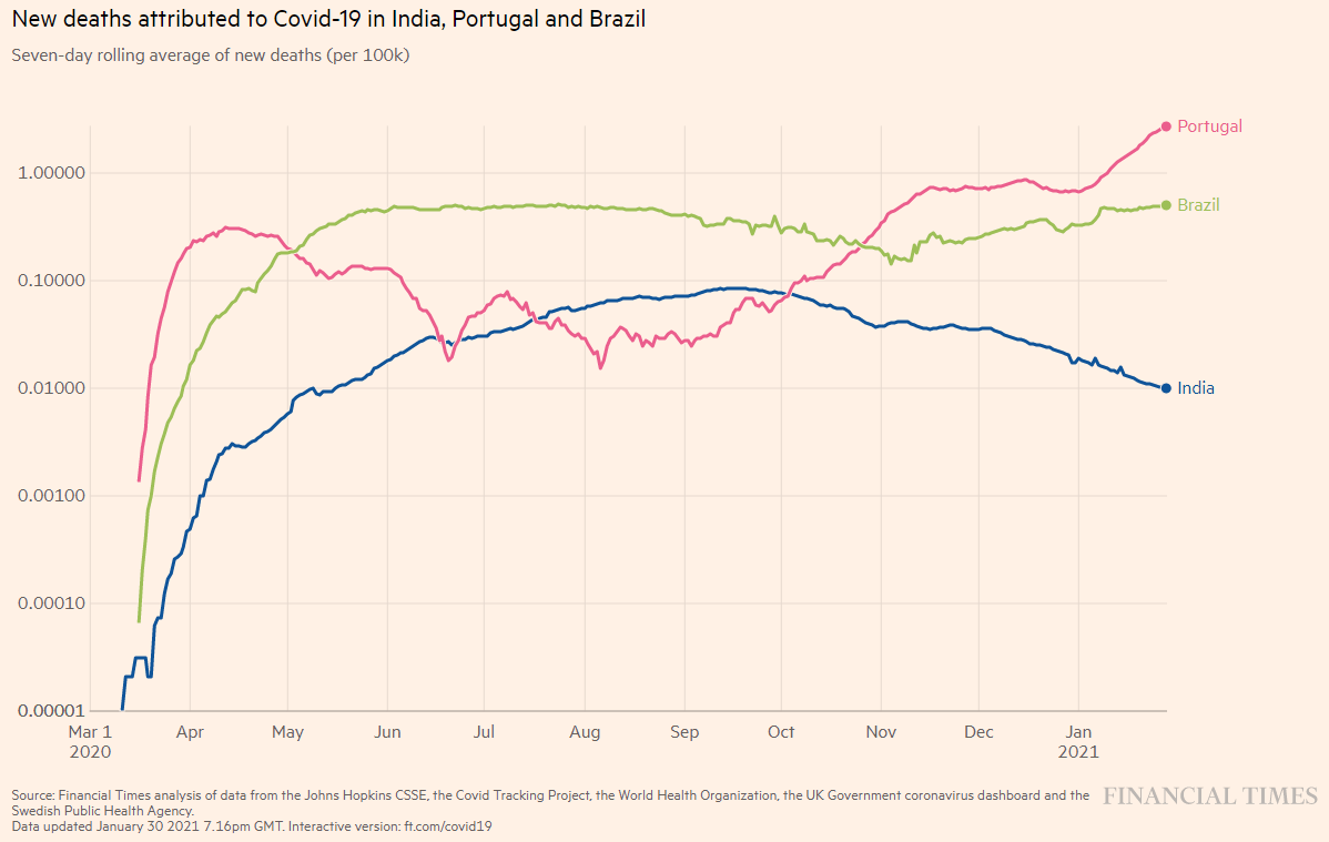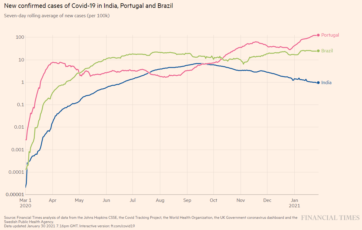 No mês de janeiro dois países tiveram comportamentos opostos já que Portugal tem batido tosos os recordes e a Índia tem apresentado números surpreendentemente baixos. A Índia tem apresentado números declinantes de casos e, no dia 27/01, tinha uma média de 1 caso por 100 mil habitantes, enquanto o Brasil tinha 25 casos por 100 mil e Portugal tinha 125 casos por 100 mil habitantes.