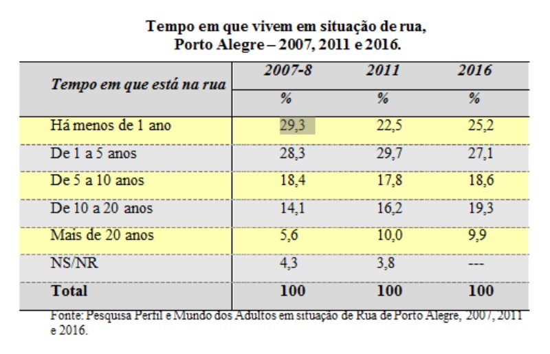 Metade dessa população afirmou ter nascido em Porto Alegre, percentual quase 10% maior que em 2007. Houve diminuição do percentual de população feminina de cerca de 20% para cerca de 14%, ou 242 pessoas em 2016. O tempo de moradia em Porto Alegre aumentou, e o tempo que está na rua, também. O tempo de rua é muito importante para políticas de atendimentos a suas demandas, pois quanto maior este tempo, maior o vínculo que estabelecem no sentido de construírem condições e artimanhas de sobrevivência e de segurança. Depois de alguns anos, há perda de vínculos, sobretudo com seu meio de origem e de hábitos, e aquisição de novos vínculos e hábitos. Com o tempo, aprendem as artimanhas desse modo de vida e se ajustam a elas, e passam a reivindicar a partir dessa condição.
