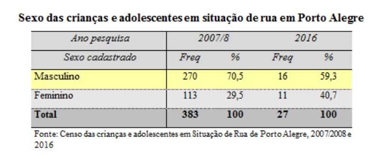 Ivaldo Gehlen – O estudo contemplou também o censo de crianças e adolescentes (conceituados pelo ECA) em situação de rua de Porto Alegre. O resultado mais impactante, e originalmente não esperado, é a fortíssima diminuição dessa população nos últimos oito anos. De um total de 383 cadastrados em 2008, para 27 em 2016. A metodologia do campo foi a mesma, ou seja, o percurso de toda a cidade mapeada como havendo informações ou indícios de presença de pessoas pertencentes a esse universo.