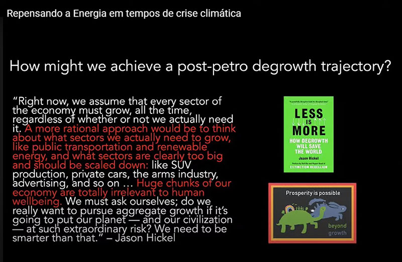 Também sabemos que nesse inverno, por causa do que está acontecendo na Ucrânia, boa parte da Europa vai se envolver num exercício de decrescimento no uso de energia. Vamos ver o que vai acontecer, há bastante ansiedade nisso, mas poderia ajudar a acelerar uma transição positiva. Algo bom que possa sair dessa terrível guerra é que as pessoas possam se superar na energia do petróleo de formas importantes. Mesmo nos Estados Unidos, que é um lugar cheio de contradições e polarizações, há alguns estados como a Califórnia, Havaí, Nova York, Washington, que estão realmente levando a sério esse decrescimento de energia, embora não saibamos ainda o quanto isso vai influenciar uma política mais ampla de decrescimento.