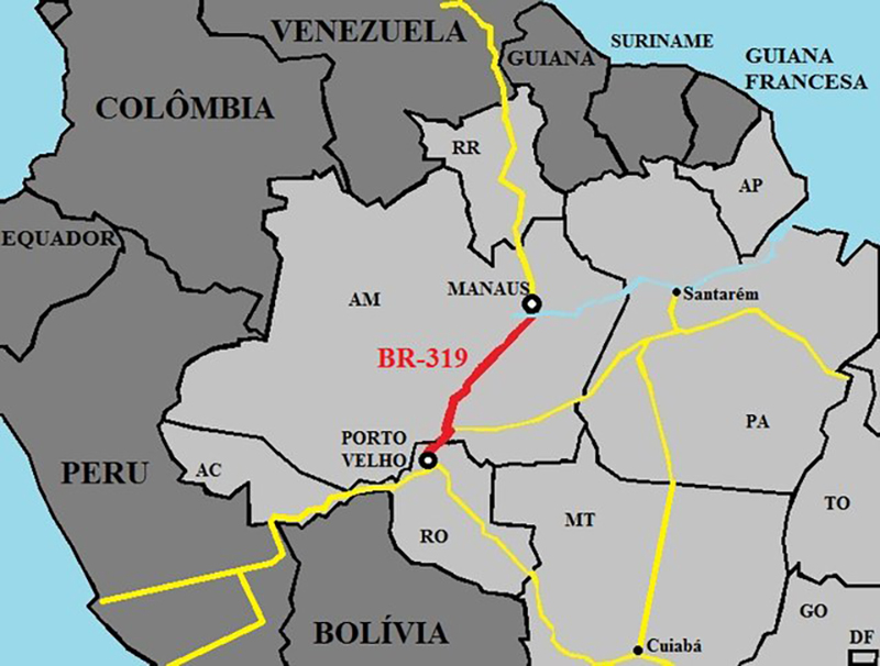 Foto: Traçado da BR 319 | Mapa: Wikipédia.