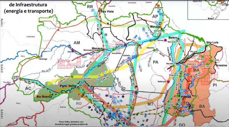 O mapa acima é interessante de observar. Estão anunciando agora no Programa de Aceleração do Crescimento – PAC a Ferrogrão, bem no centro do mapa da Amazônia. Já temos, também no centro, a BR 163 que produziu um estrago irreversível nesse corredor. E agora vamos duplicar esse corredor com a Ferrogrão. Era um projeto que nem o governo Bolsonaro conseguiu tirar do papel e agora é apresentado dentro da lista dos projetos do PAC.