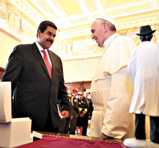 Contudo, o encontro mais importante talvez tenha sido o que teve com o papa Francisco, que o recebeu em audiência particular, na segunda-feira pela manhã, no Vaticano. Faziam parte da delegação que o acompanhava, entre outros, sua esposa, Cilia Flores, e o ministro de Relações Exteriores, Elías Jaua – que fazia um giro por alguns países europeus -. Depois de ter saudado o grupo na Sala do Tronetto, do Palácio Apostólico, o papa Francisco e o presidente Maduro passaram à Biblioteca, onde normalmente os pontífices realizam as audiências particulares. O presidente venezuelano e o pontífice ficaram reunidos cerca de 20 minutos, num clima de “grande cordialidade”. Segundo o comunicado oficial do Vaticano, que não entrou em detalhes sobre o que exatamente conversaram, eles tocaram em vários temas. Entre os pontos abordados, conversaram sobre a situação social do país, após a morte de Hugo Chávez, a luta contra a pobreza e contra a criminalidade e o narcotráfico, além da situação política regional, em especial sobre o processo de paz na Colômbia. No entanto, também conversaram sobre as relações entre a Igreja e o Estado na Venezuela e o Papa insistiu na necessidade de um diálogo sincero e constante, entre a Conferência Episcopal e o Estado venezuelano, “para o desenvolvimento de toda a nação”, informou o comunicado.