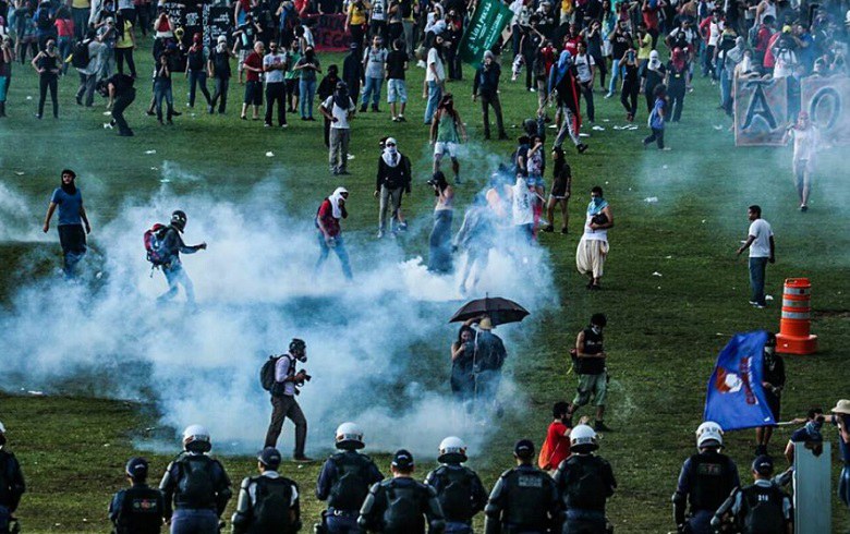 A tropa de choque da Polícia Militar do Distrito Federal desmobilizou a manifestação, que seguia pacífica, com o uso de bombas de gás lacrimogêneo e de efeito moral. "Não dá nem pra respirar neste lugar. Estamos aqui manifestando nosso apoio aos estudantes. Consideramos inaceitável esse grau de repressão. Temos adolescentes, isso é uma grande irresponsabilidade", afirmou a deputada federal Maria do Rosário (PT-RS), que foi até o local, acompanhada do deputado Paulo Pimenta (PT-RS), para prestar solidariedade aos manifestantes.