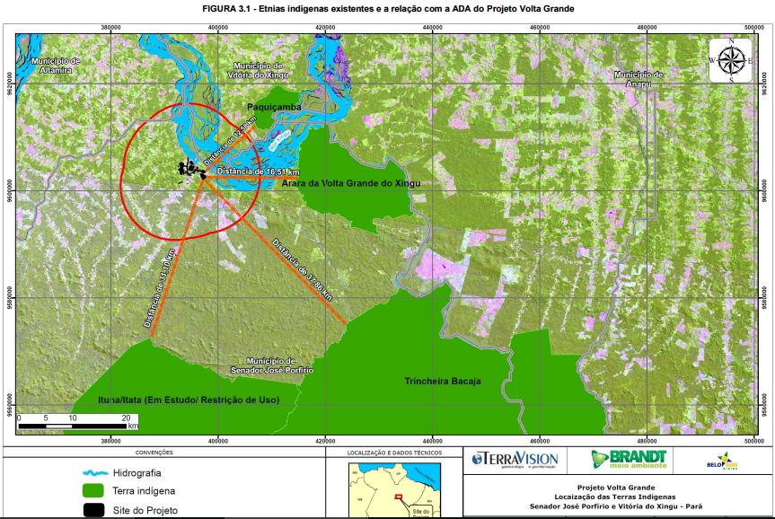 Mapa realizado pelo Instituto Socioambiental mostra que o projeto se encontra 9,5 km de distância da Terra Indígena (TI) Paquiçamba, a 13,7 km da TI Arara da Volta Grande do Xingu. Organização também cita TI Ituna/Itatá, habitada por indígenas isolados