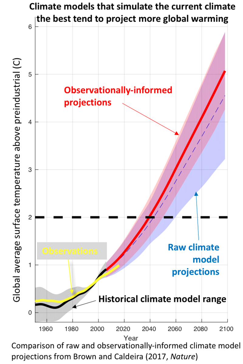 Brown e Caldeira pesquisaram se a extremidade superior ou inferior desse intervalo é mais provável que seja exata. Sua estratégia baseou-se na ideia de que os modelos que serão os mais habilidosos em suas projeções de aquecimento futuro também devem ser os mais habilidosos em outros contextos, como simular o passado recente. O estudo de Brown e Caldeira elimina a parte inferior desta faixa, achando que o aquecimento mais provável é de cerca de 0,9 graus Fahrenheit (0,5 graus Celsius) maior que o que os resultados do modelo bruto sugerem.