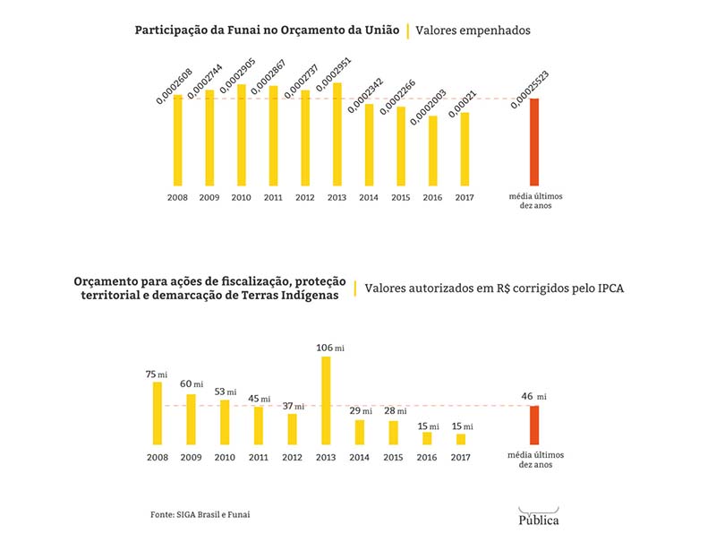 Entre 2014 e 2017, a participação da Funai no orçamento geral da União caiu 25% em relação a 2010-2013 e representa hoje 0,002% do total. O orçamento autorizado para este ano é de R$ 596 milhões – ligeiramente superior ao de 2017 (R$ 548 milhões), mas insuficiente para recompor o déficit orçamentário do órgão. Já a verba de proteção, demarcação e fiscalização é a menor na última década, segundo o levantamento da Pública. Entre 2014 e 2017, a queda foi de 65% em relação ao período de 2010-2013. De acordo com o último relatório de gestão da Funai (2016), com a redução orçamentária seria impossível cumprir a meta de fiscalizar 138 Terras Indígenas (TIs) em 2017 – há 435 TIs regularizadas no país, e mais de cem em processo de demarcação, além daquelas ainda em estudo, segundo os dados da Funai.