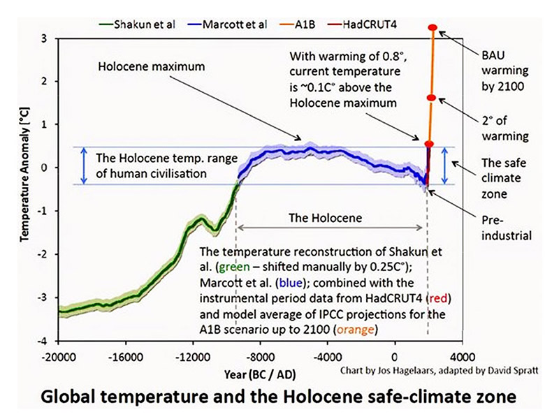 Ocorre que a maioria das pessoas negam a ciência ou dela duvidam, digamos, “em boa fé”, ou seja, não por defenderem interesses econômicos. Essa maioria duvida apenas porque tem dificuldade de entender, após milênios de relativa estabilidade climática, que a nova época histórico-geológica iniciada em meados do século XX, o Antropoceno, nos introduz numa zona de desestabilização climática, já provavelmente irreversível, do sistema Terra. Como bem afirma Owen Gaffney, do Stockholm Resilience Centre, “as sociedades industriais receberam da enganosa estabilidade do Holoceno, os últimos 11.700 anos, um falso senso de segurança. Agora, ejetamos a Terra de seu envelope interglacial e estamos adentrando território não mapeado” [XI]. Com efeito, como mostra a Figura 3, o último degelo com o qual se abre a época do Holoceno (11.700 AP – 1950 circa), não apenas elevou a temperatura média superficial do planeta entre 3,5 oC e 4 oC até meados do século XX, mas a manteve numa faixa de variação bastante estreita: 0,5 oC para baixo e para cima em relação à média do período. Essa relativa estabilidade climática criou a chamada zona de segurança climática que permitiu a agricultura e o florescimento de toda civilização.