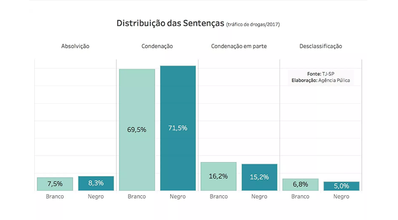 Nas sentenças disponíveis para acesso público online e digitalizadas no Banco de Sentenças do Tribunal de Justiça de São Paulo foi realizada a classificação por raça e cor e por categorias: absolvição, condenação, condenação em parte e desclassificação – quando o réu é acusado de tráfico, mas é condenado apenas por “posse de drogas para consumo pessoal”.