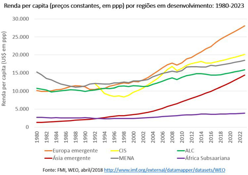 Já a Ásia emergente ou em desenvolvimento que reúne 30 países (Bangladesh, Butão, Brunei, Camboja, China, Fiji, Índia, Indonésia, Kiribati, Laos, Malásia, Maldivas, Ilhas Marshall, Micronésia, Mongólia, Mianmar, Nauru, Nepal, Palau, Papua-Nova Guiné, Filipinas, Samoa, Ilhas Salomão, Sri Lanka, Tailândia, Timor-Leste, Tonga, Tuvalu, Vanuatu e Vietnã) tinha uma renda per capita de somente R$ 1,3 mil em 1980 e deve chegar a US$ 14,4 mil em 2023, um crescimento de 11 vezes no período. Estas duas regiões estão em processo de convergência com os países ricos e desenvolvidos.