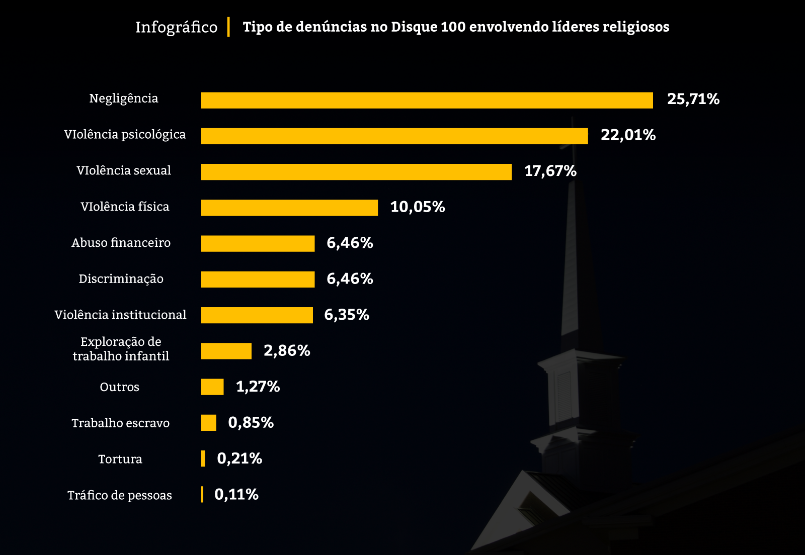 Entre 2016 e 2018, a maior parte das denúncias envolveu situações de negligência, isto é, quando líderes religiosos são acusados de maus-tratos, por exemplo, como privação de cuidados básicos, como acesso a alimentação, medicamentos e higiene. O segundo tipo de violação mais denunciado foi violência psicológica; o terceiro, violência sexual.