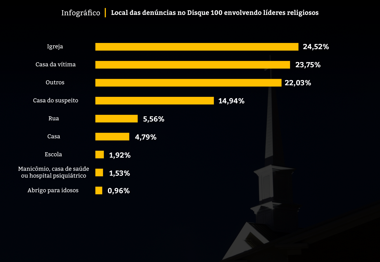 Igrejas e templos são o lugar onde mais teriam ocorrido as violações – quase uma a cada quatro denúncias revela esse tipo de local. O número é próximo ao das denúncias que apontam a casa da vítima. Em seguida vêm outros locais, casa do suspeito e na rua. Há, ainda, denúncias de escolas, manicômios, hospitais psiquiátricos, casas de saúde e abrigos para idosos.