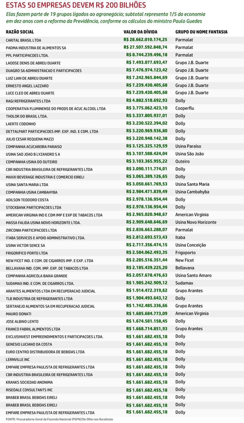 Levantamento feito pelo De Olho Nos Ruralistas, utilizando dados da Procuradoria-Geral da Fazenda Nacional (PGFN), mostra que apenas 50 empresas ligadas ao agronegócio que mais devem tributos à União acumulam R$ 205 bilhões em débitos. Como referência, o volume das dívidas do setor representa 20% do total de R$ 1 trilhão que o ministro da Economia, Paulo Guedes, projetava inicialmente economizar em dez anos com a reforma da Previdência.